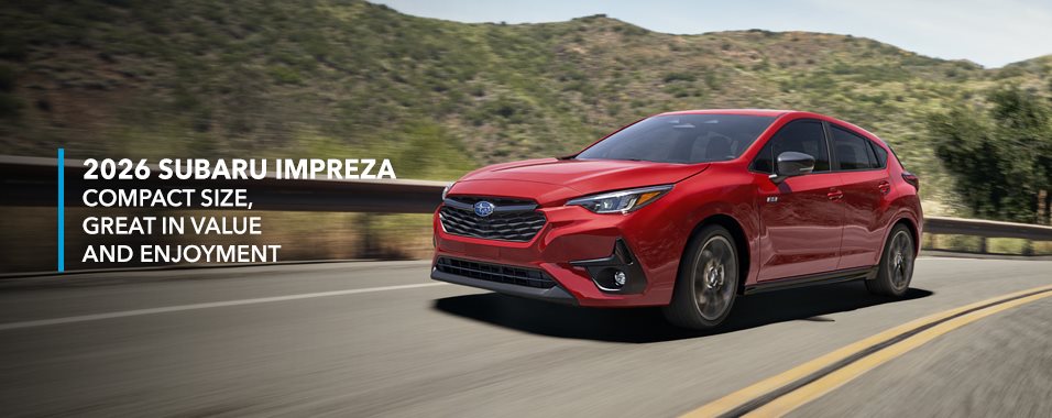 Engineered and designed from the ground up, the 2026 Subaru Impreza showcases a dynamic silhouette with more advanced technology, vastly improved handling and more advanced safety features. This trustworthy 5-door hatchback also features standard Subaru Symmetrical Full-Time AWD, a surprising amount of interior space, improved interior fit and finish, and roof crossbar mounting points for extra versatility. Inside the well-designed cabin, there’s an available 11.6-inch touchscreen, wireless charging pad, and wireless Apple CarPlay® and Android Auto integration. For even more performance, check out the Impreza RS, with its 180-horsepower SUBARU BOXER® engine, and unique sporty styling elements inside and out. No matter which Impreza you choose, you’re guaranteed to be driving a class-leading compact with uncommon degrees of sheer enjoyment, fuel efficiency, reliability and quality engineered right in.
